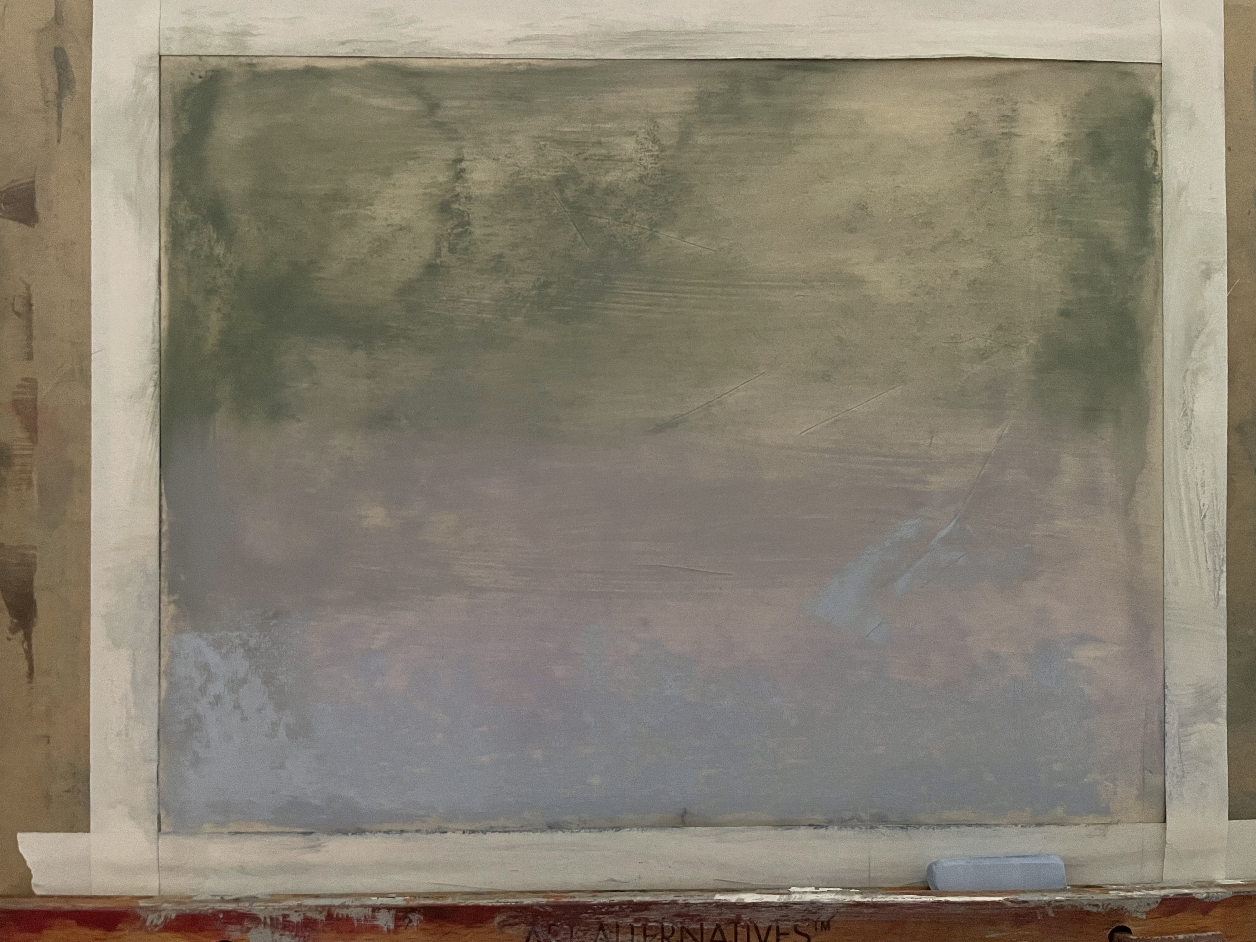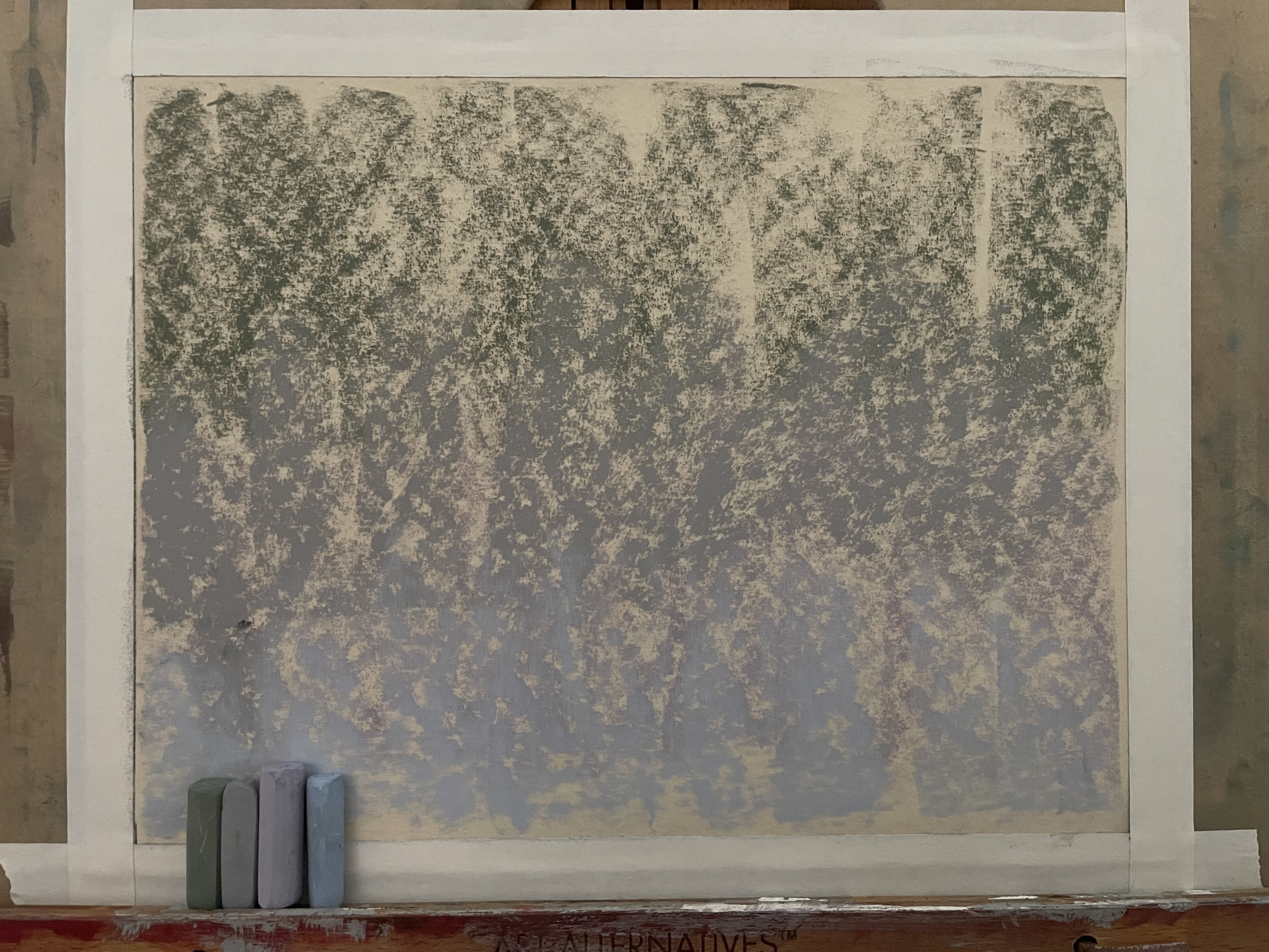 Step 2: Use soft pastel sticks to block in your background. Choose at least two different background colors – one for the lighter areas and another for shadows.