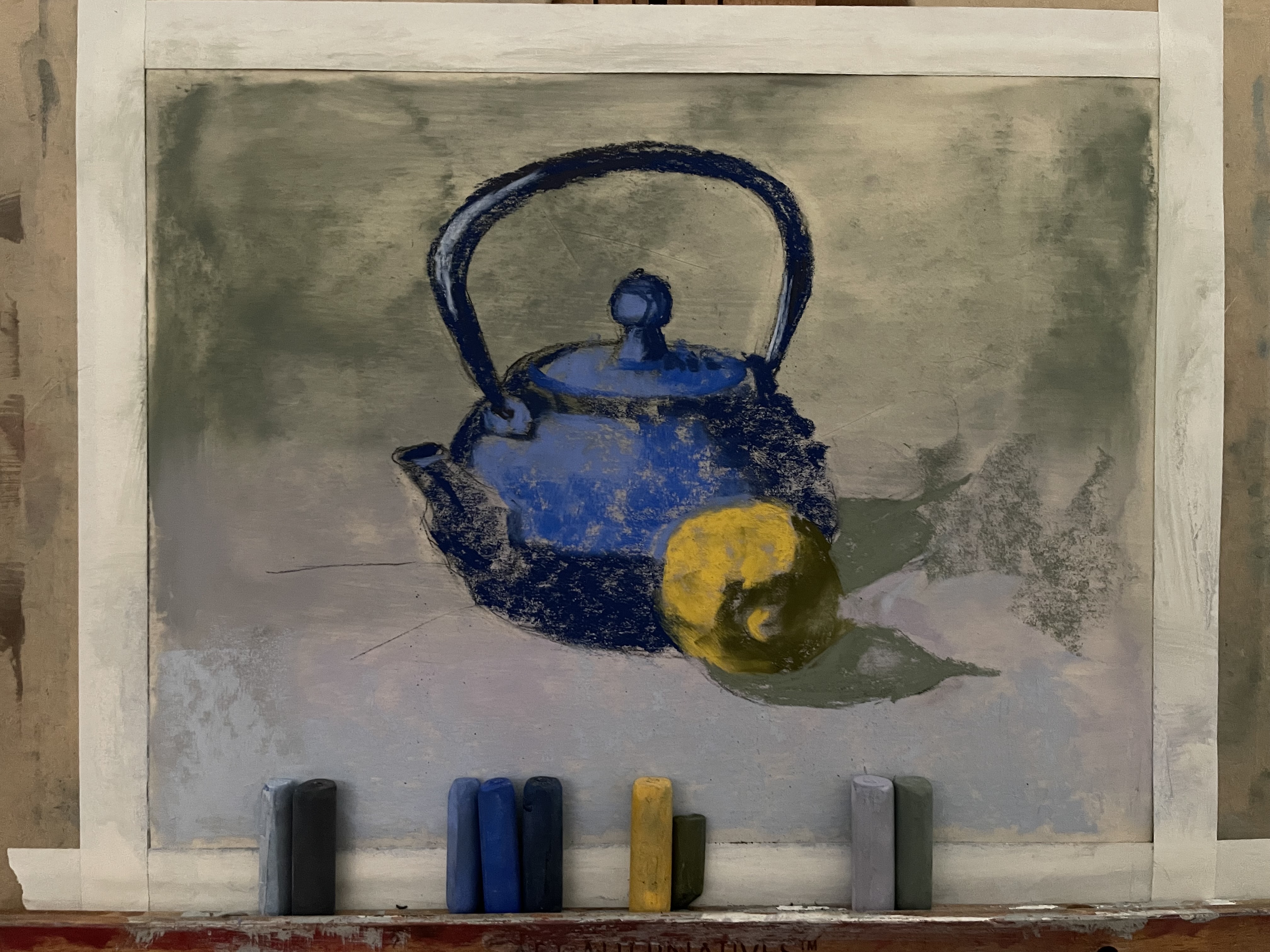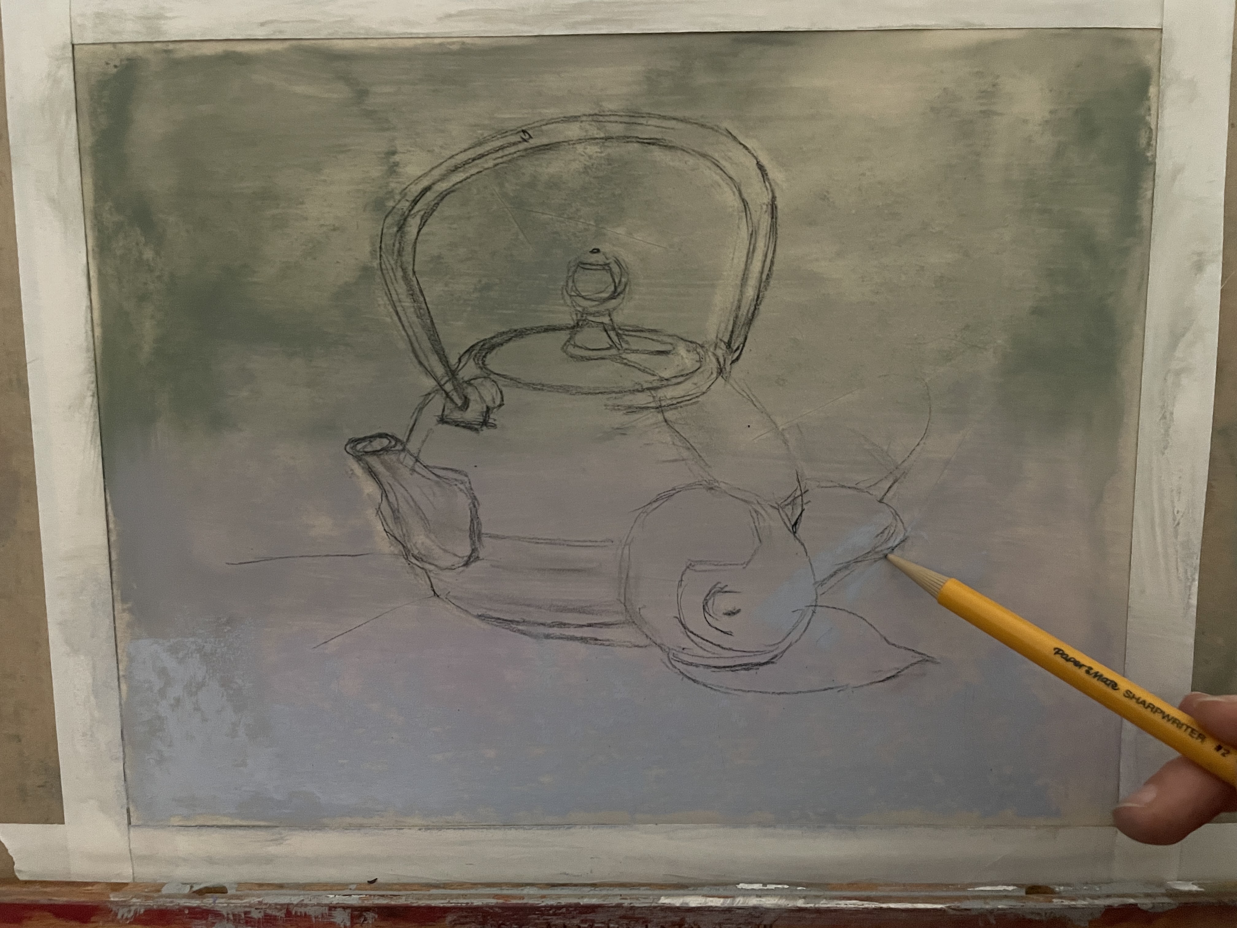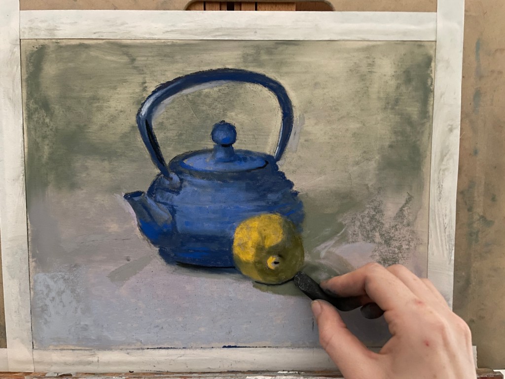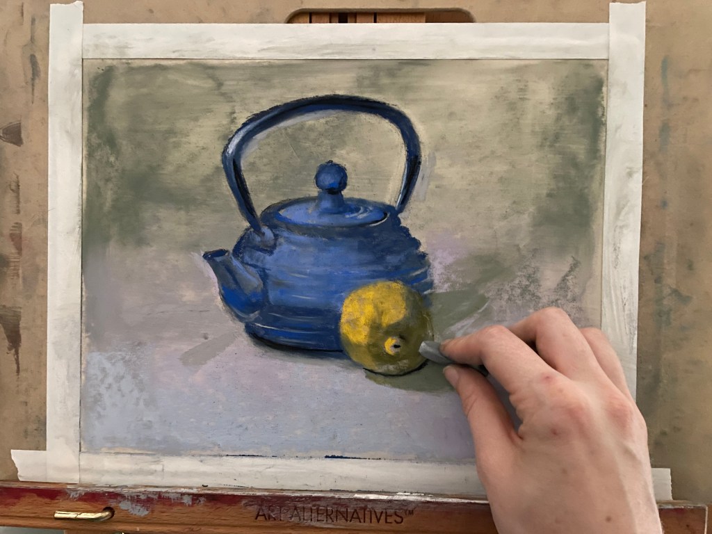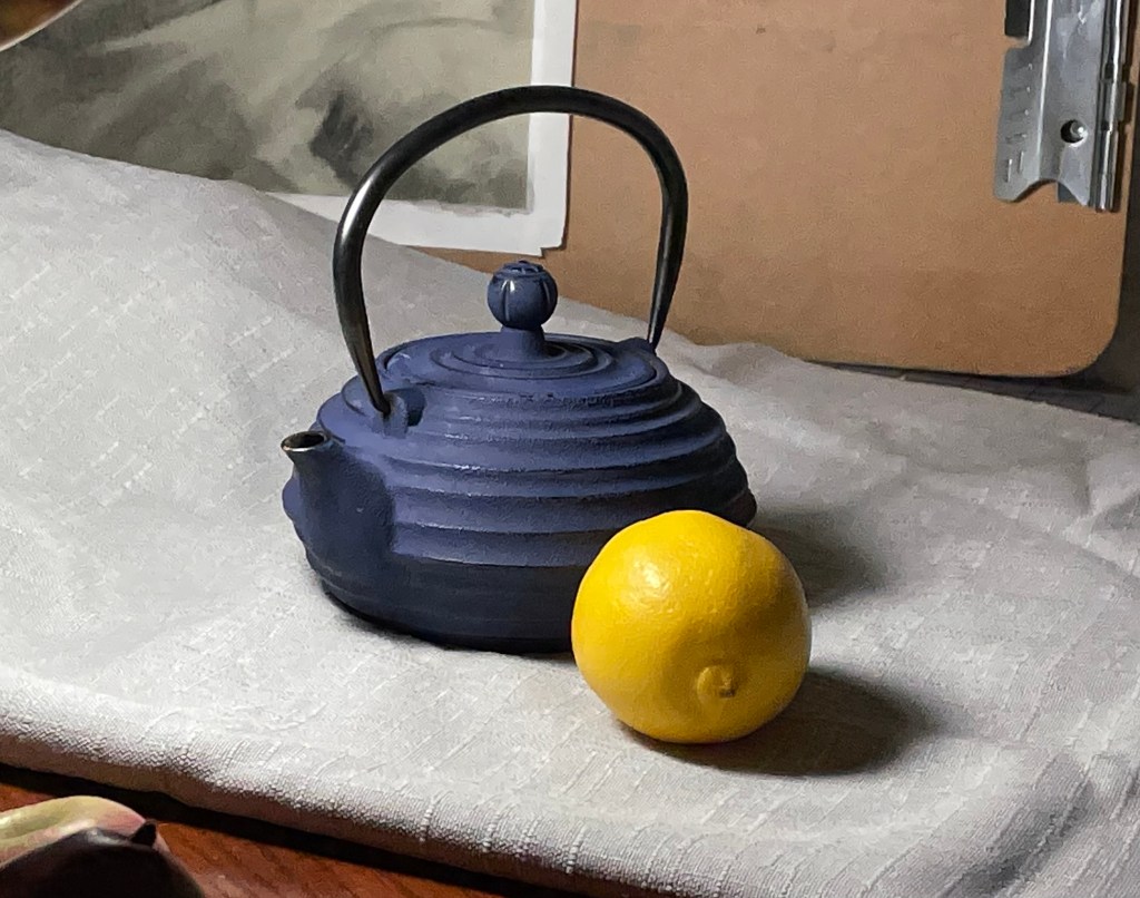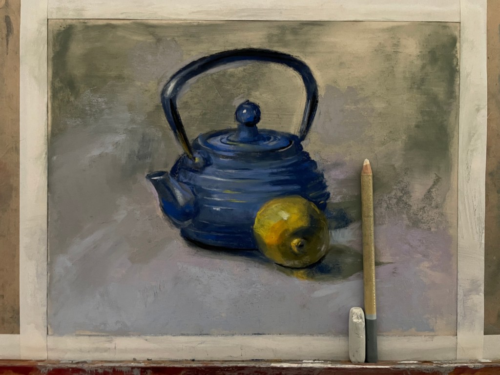 Step 8: Add reflected light. “Reflected light” refers to the area of the core-shadow that is brighter towards the outside edge of the object. The reason for this is that light reflects from the background back onto the object. Objects are also reflecting their colors onto each-other. In this still-life, the light grey background is reflecting up onto the underside-areas of my teapot and lemon. In addition, the yellow of the lemon is reflecting onto the teapot in some areas.